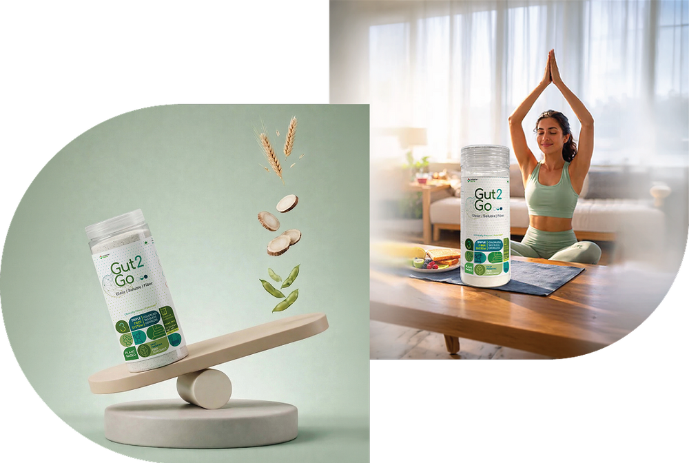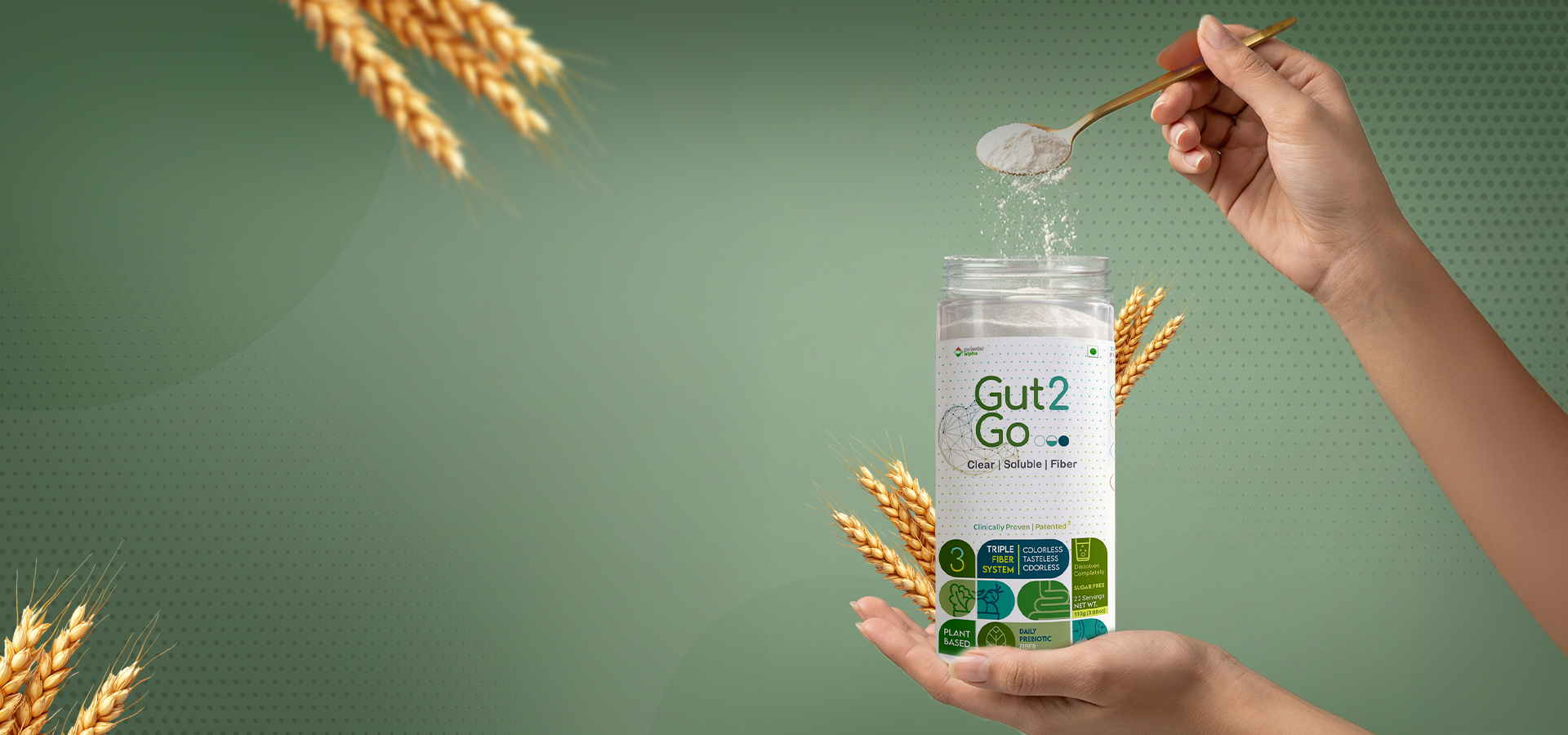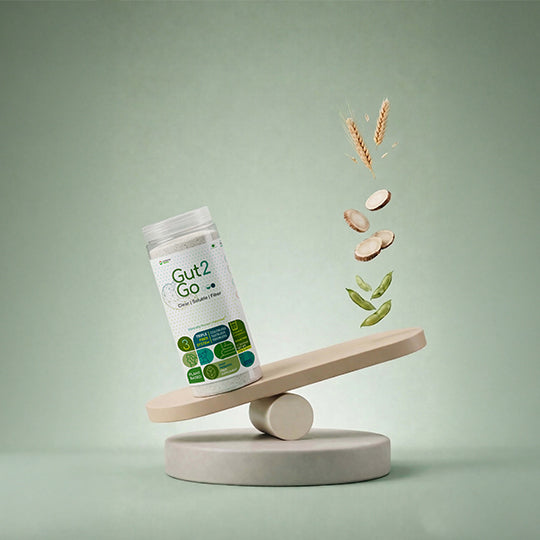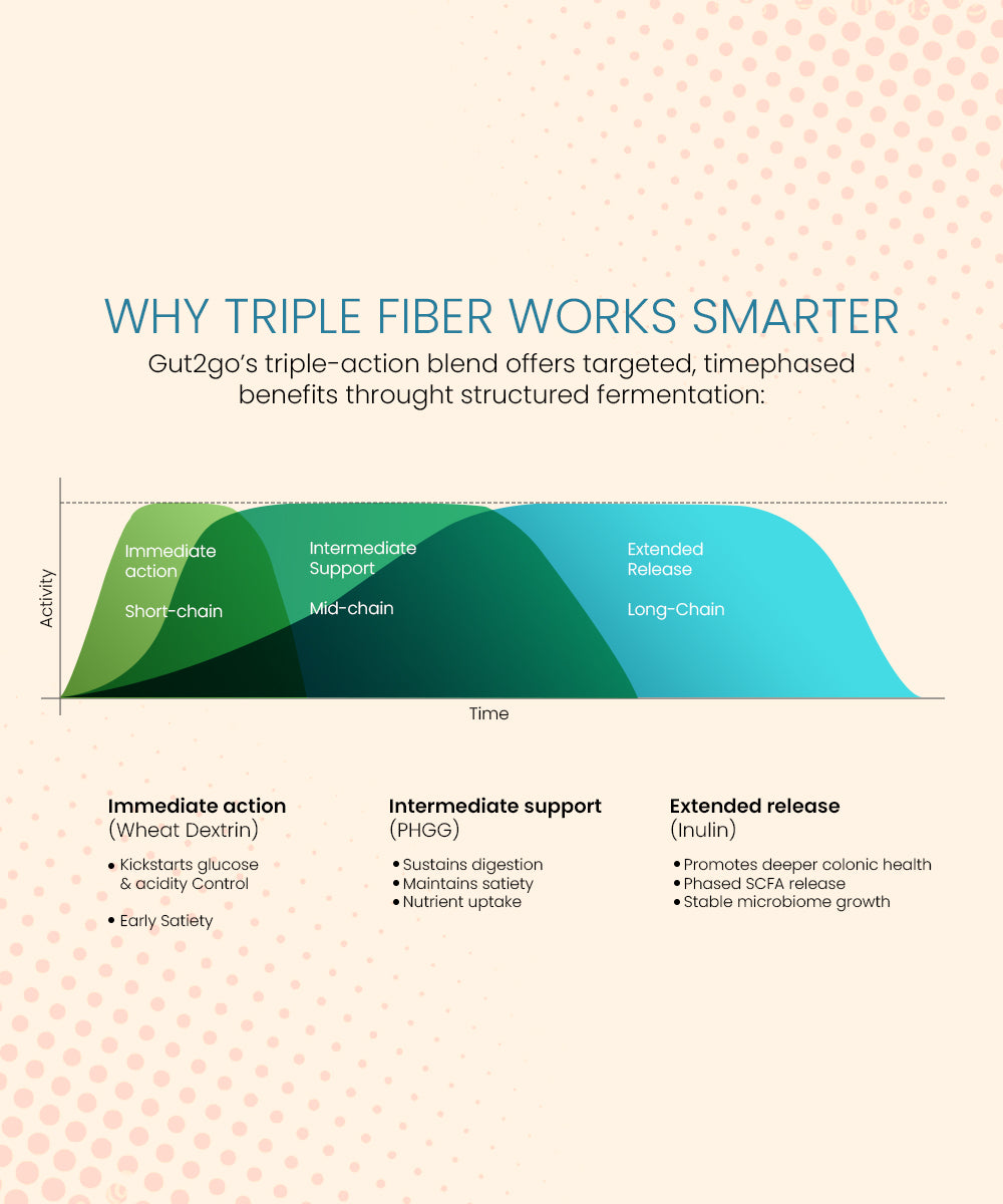 Gut2Go's Triple Fiber blend offers targeted, time-phased benefits through structured fermentation which health to reduce blood sugar, manage bad cholesterol and triglycerides, relieve acidity (GERD), and assist in regularising bowel movement.
